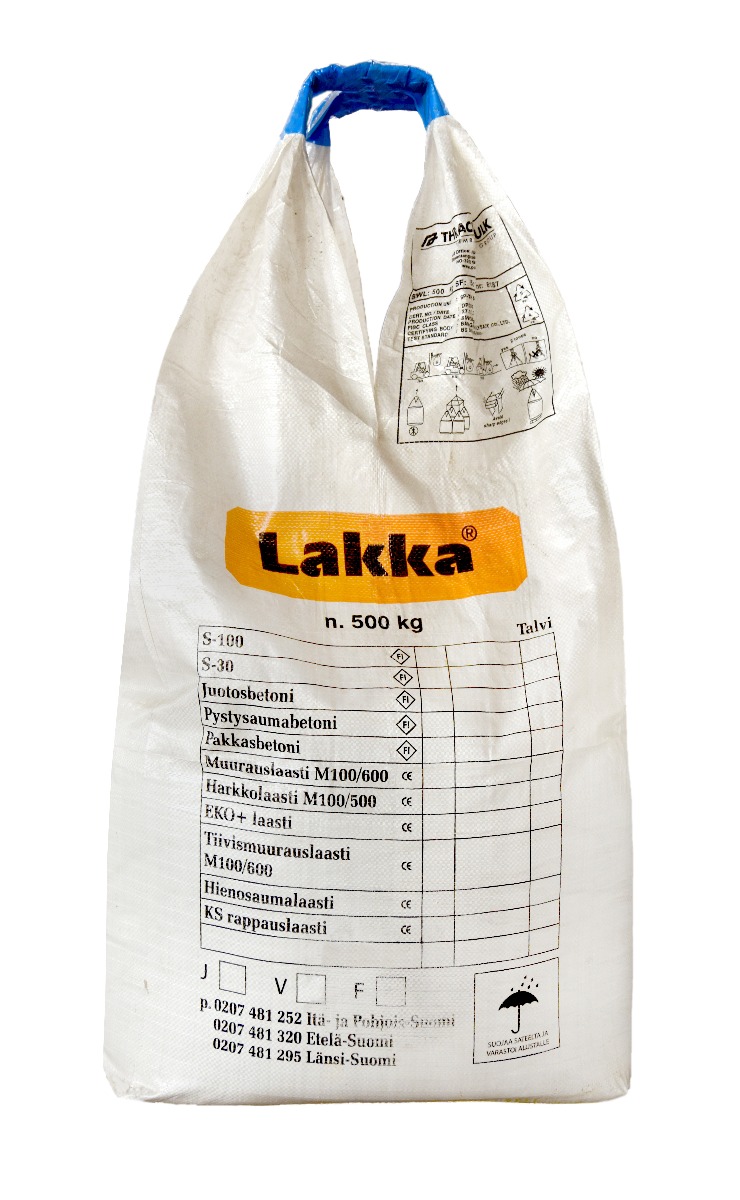 Kuivabetoni S100 500kg Lakka on säänkestävä ”perusbetoni”, jolla teet betonirakenteiden korjaukset sekä perustusten, anturoiden, lattioiden ja portaiden valut. Puristuslujuus 30 MN/m².