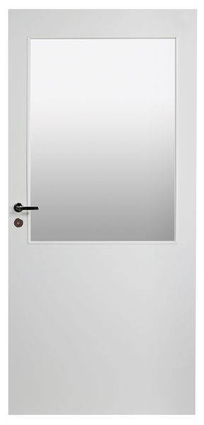 Huullettu sileä väliovi/sisäovi valkoiseksi maalattuna ja kirkkaalla lasilla varustettuna. Oven paksuus vakio 40mm. Ovi on moduulimittainen ja standardikokoinen ja siksi se soveltuu myös asennettavaksi jo olemassa oleviin karmeihin.