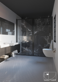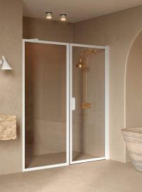 Laadukas Hietakarin valmistama tilanjakaja kääntyvillä pariovilla, joista toisessa kiinteä osa. Moderni ja tyylikäs Bläk sarjan tilanjakaja on erinomainen valinta suihkusyvennykseen, jonka vieressä on kaluste. Kiinteä seinä ja oviaukko voidaan mitoittaa niin, että kiinteä suojaa kalustetta ja oviaukko on vapaaksi jäävän kulkutilan levyinen. Ovet voidaan mitoittaa symmetrisesti tai niin, että ovet ovat erikokoiset. Kun suihku ei ole käytössä ovet voidaan kääntää rakennuksen seiniä vasten. Ovet kääntyvät molempiin suuntiin 90 astetta ja ovat varustettu säädettävällä keskityksellä joka pyrkii palauttamaan lasin takaisin auki ja kiinni asentoihin. Magneettitiivistepari pitää oven tiiviisti suljettuna suihkun aikana. Suihkulasi on 6mm paksua karkaistua turvalasia ja heloitukset sekä vinotuet maalattua messinkiseosta. Profiili on jauhemaalattua alumiinia.